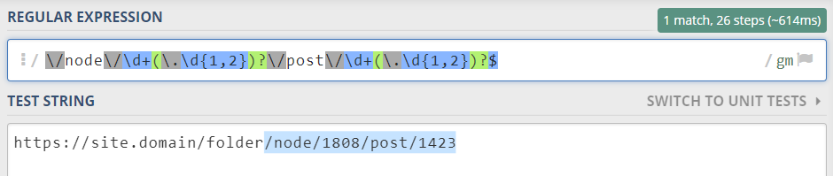 URL: <https://site.domain/folder/node/1808/post/1423> Regex:/node/\d+(.\d2)?/post/\d+(.\d2)?$