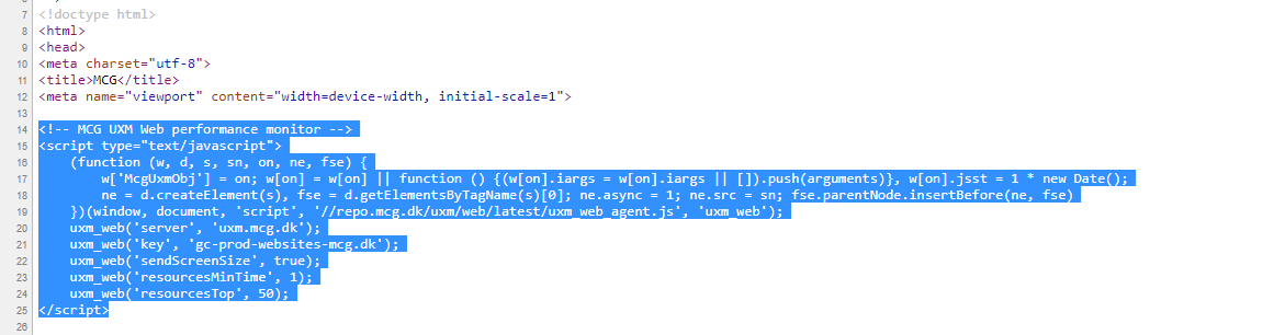 • Apply the UXM Web Agent script to pages where you want to include the agent, see Web Agent Options for how to load the script blocking or async.